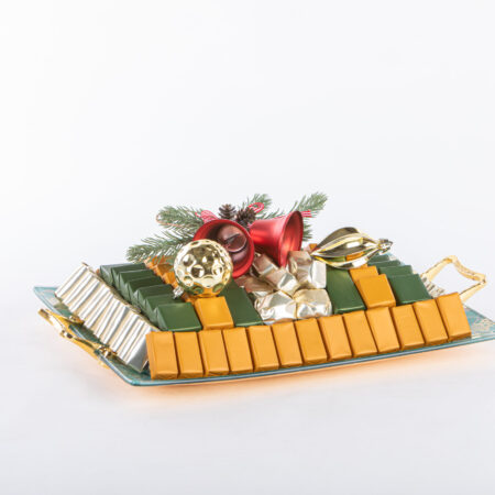 Sublime plateau de présentation en verre haut de gamme, avec des motifs recouverts de feuille d’or Mix Chocolat au Lait et Noir